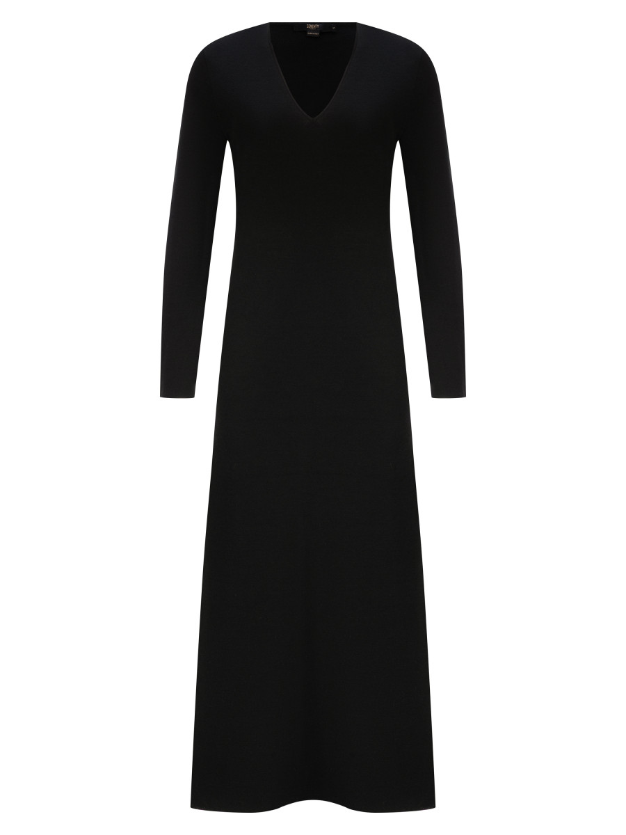 Длинное платье с v-образным вырезом и глубокими разрезами по бокам. Невероятно женственная и элегантная модель выполнена из смеси акрила, шерсти и небольшого процента полиэстера. Мягкая, эластичная ткань идеально ложится по фигуре, подчеркивая изгибы тела. Благодаря смесовому составу, изделие менее подвержено растяжению и пиллингованию. Глубокие разрезы носят не только лишь декоративную функцию, но и обеспечивают комфорт в шаге. Стильно обыграть платье помогут аксессуары и лаконичные украшения. Параметры изделия для размера 40 (42): Обхват груди 100 см, Длина рукава от плеча 67 см, Длина изделия по спинке 145 см.